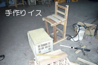 2006/7/3 雨 じいちゃんが、手作りのイスを制作中です。胡蝶蘭の植え替え時に、座るイスです。1枚板から、ここまで組み立てました。途中、手を切って血を出してしまいました。