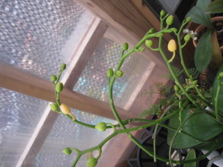 4月に花芽が伸び始めて今はだいぶ伸びたのですが一向に蕾が膨らみません。カーテン越しの東の窓辺に置いてあります。