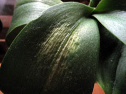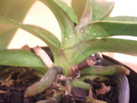 最低気温が下がるにしたがって胡蝶蘭も低温乾期(原産地の冬)に備えて準備を始めます。赤紫の色素アントシアニンは低温・強光線に対する防御用のもので、株が正常な代謝をしている証拠でもあります。
