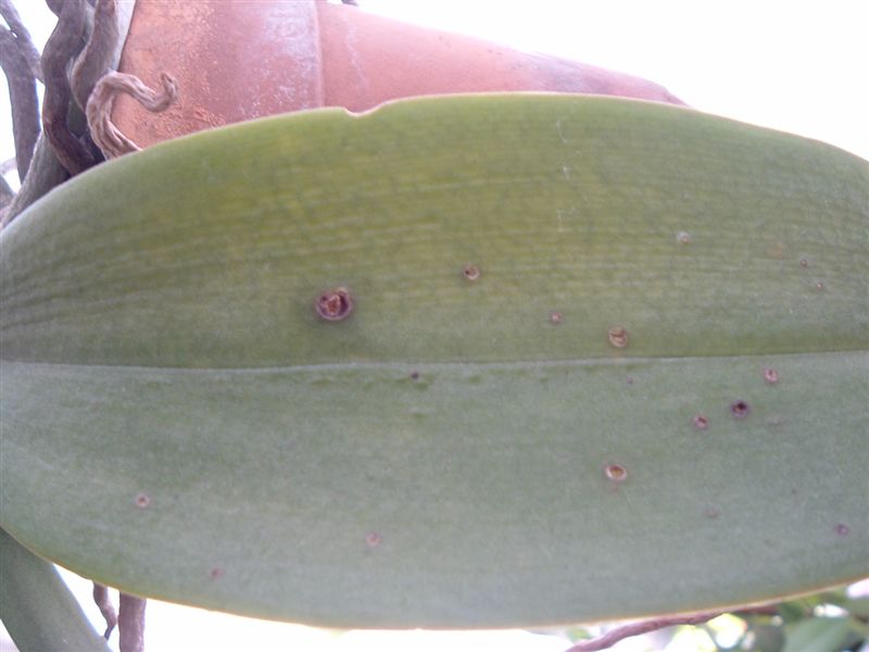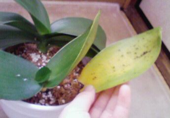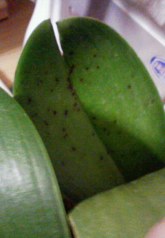 最近、ホームセンターで買った胡蝶蘭なんですが、葉に斑模様が付いてます。黒い変な跡も付いてます。