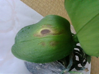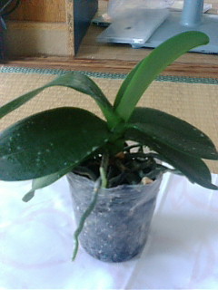 7月の2週目くらいから、葉っぱに異常が現れました。真ん中あたりから、まるで内出血したかのように、黒とも茶ともつかぬ色に変色し始め、その周辺から黄色に変色し、ついには落ちてしまいました。肥料があわなかっか、日が強すぎたかと、思い、とりあえず、肥料を中止し、日ざしの強そうな日は窓の半分に、厚手のカーテンをして、胡蝶蘭をそちら側へやり、のこり半分にレースのカーテンをし、そちら側の窓をあけてやるようにしました。そして、葉の変色した部分を、神棚のお神酒用の日本酒で消毒したハサミで切り取ってやりました。すると内出血のような葉の変色は止まりましたが、下の葉から徐々に色褪せて黄色くなり、しわしわになって落ちて行き、どんどん葉が少なくなってきました。そして、ついに5つあるうちの1つの株の、たった1枚残っていた葉が、まだ緑できれいなのに、根元からぽっきり折れて無くなってしまいました。(泣)