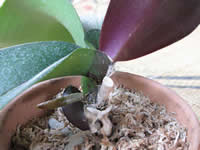 植え込み材料のシンビ、カトレア用は軽石とバークの混合物で、バーク単用より乾きが早いというか保水しません。保水が悪いので根が乾くことも必要ではあるが水分の好きな胡蝶蘭にはちょっと不向き、というか、水遣りを頻繁にしなければなりません。長期に乾かして急に多湿高温にするとフザリウム症が発生しやすいです。