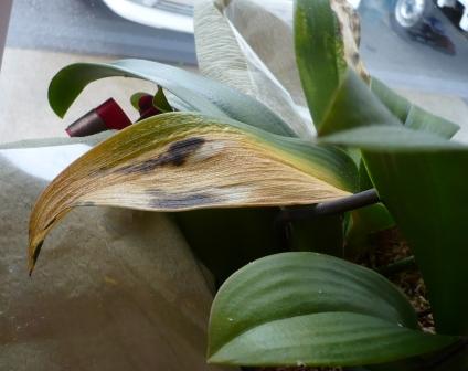 ひろしさんこたえ> 葉の枯れは何らかの病気のようです。自然に落葉するのを待っていると他の葉、あるいは茎をいためる可能性がありますので切り落として切り口からその葉の付け根の周囲に濃く溶いたエムダイファーを筆で塗りこめておきます。 カビのような虫のようなものは(画像からはいまいちよくわからなかったのですが)おそらくカイガラムシでしょう。蔓延すると厄介です。カビのように粉っぽく見えるのは卵塊ですからそのままにしておくと厄介です。カサブタ状のものが成虫ですから掻き落とし、卵塊は戸外で柔らかい歯ブラシなどで掻き落とします。その後は中性の食器洗剤(中性であることとプロピレングリコール〜PGと略記されることもある〜を「含まない」ことを必ず成分表示をみて確認してください)の2000倍液で株全体を洗います。鉢にも灌注してください。その後冷たくない水で株をすすぎ、鉢内も洗い流すように水遣りしてみずきりしてください。