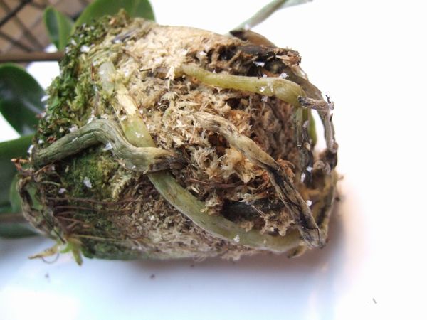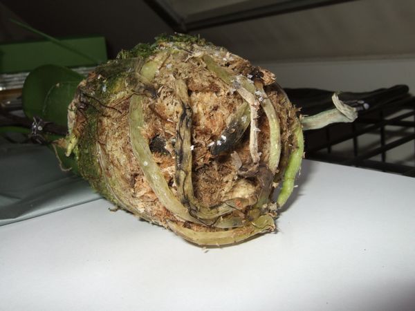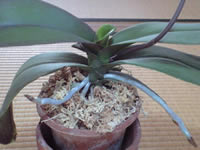 元株の回復は期待できそうにない感じですね。いずれにしても同じ環境の健康な株が花芽を分化させたということは、胡蝶蘭としては成長期の気温ではなく休眠期(胡蝶蘭は休眠期に花芽分化から開花まですませるのです)の気温であるということですから、脇芽もその根も伸長が止まるのはやむを得ません。