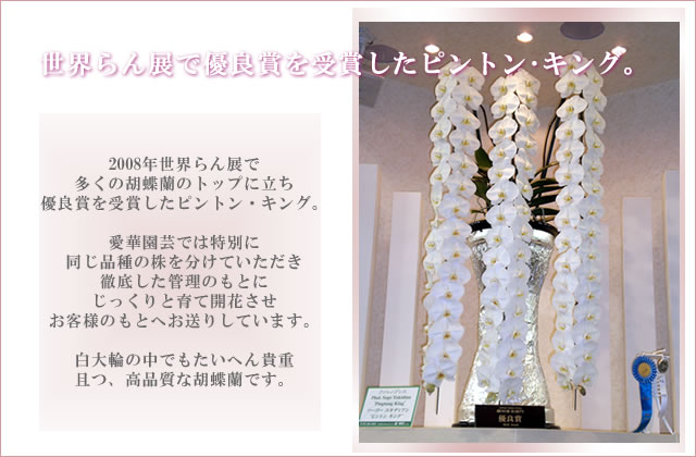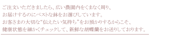 ■販売のこだわりは、花を右から左へのような仕事はしません。大切に育てた胡蝶蘭を最適最良な手間ひまをじっくりかけ、良い品質でお客様へお届けし、喜んでいただくことです。 |