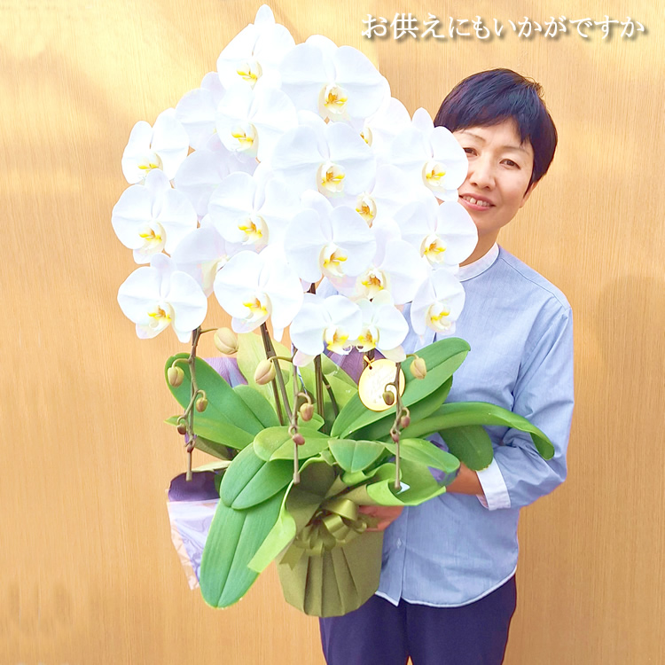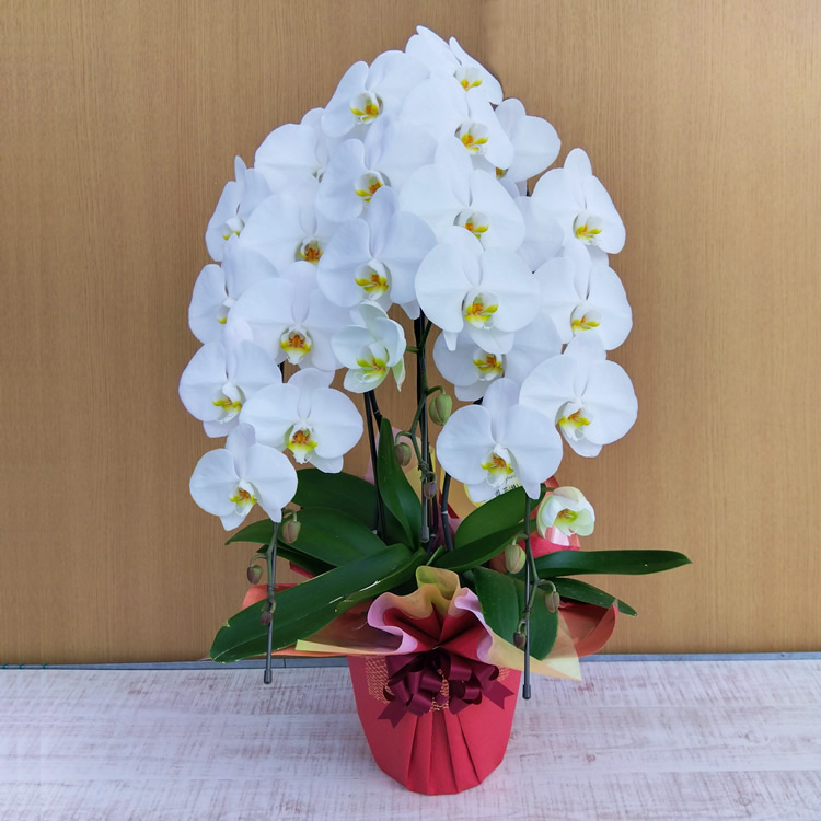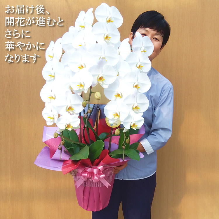 高さ80cmほどのスマートな胡蝶蘭。ご自宅にも飾りやすいサイズです。お誕生日や結婚の贈り物にもおすすめです! リーズナブルなこのお値段で上質な大輪胡蝶蘭。滅多に出会えるものではありません。 鉢のサイズは7寸ですが、花弁の大きさは一級品です。 ご自宅に飾るのにちょうどいい大きさだと、実際にご注文いただいたお客様よりご感想をいただいております。あまり広くない店舗などにも最適です。 胡蝶蘭を贈るのであれば、せっかくですから、高品質な胡蝶蘭をぜひお選び下さい。お祝いに、お供えに・・・白い大輪の胡蝶蘭は老若男女問わず喜ばれる鉢花です。