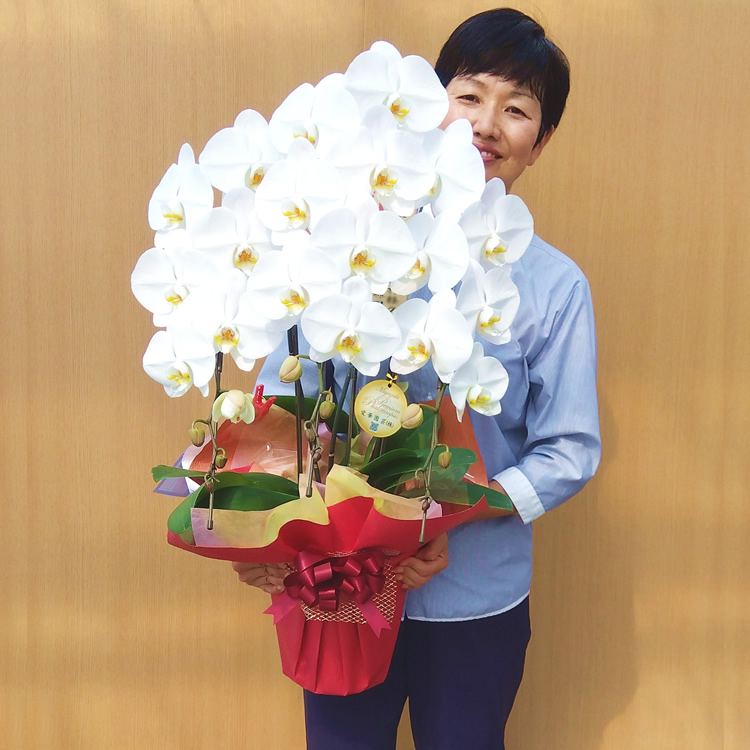 ■スタッフ:N (出荷担当) お誕生日に頂いた白大輪を、家に持ち帰りました。マンションやアパートには豪華すぎて多少置き場に困りますが、開店祝い等のお祝いには満足度大です。 ■スタッフ:Y (仕立て担当) 私の両親は、花屋さんで買うほど胡蝶蘭好きだったのですが、私がこちらで働きだしてからは、愛華園芸の胡蝶蘭の大ファンです。