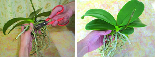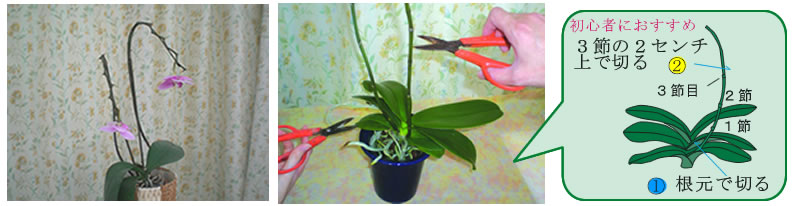 花が終わったら、胡蝶蘭の根元から、花芽を切り取り除きます。切り方は2通り